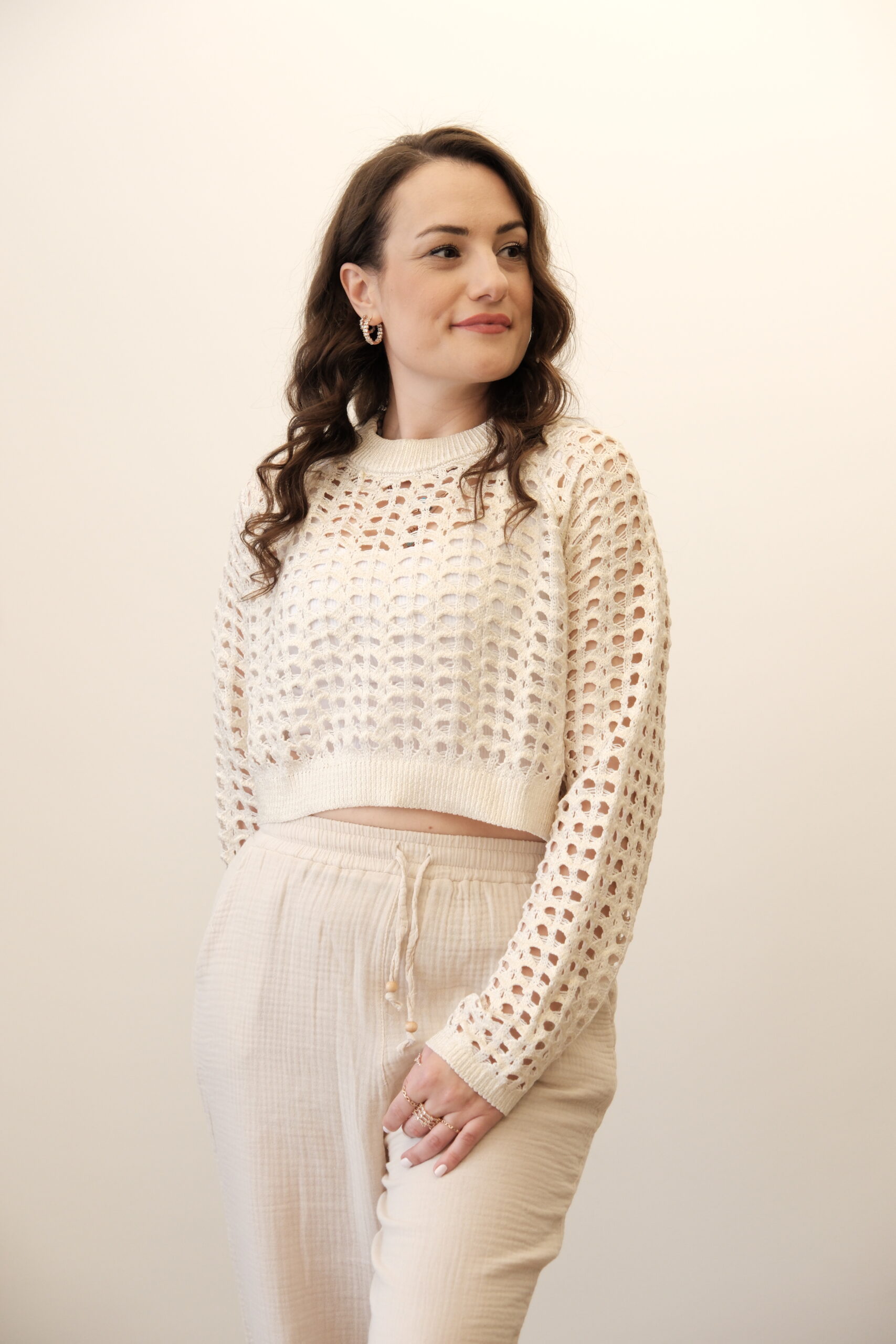 Krem tonlarının zamansız zarafetiyle uyum içinde olan bu parça, yüksek belli pantolonlar, etekler ya da hatta denimlerle kolayca kombinlenebilir. Günlük kullanımda sade bir şıklık, akşam davetlerinde ise bohem bir ışıltı yakalamak isteyen kadınlar için ideal.