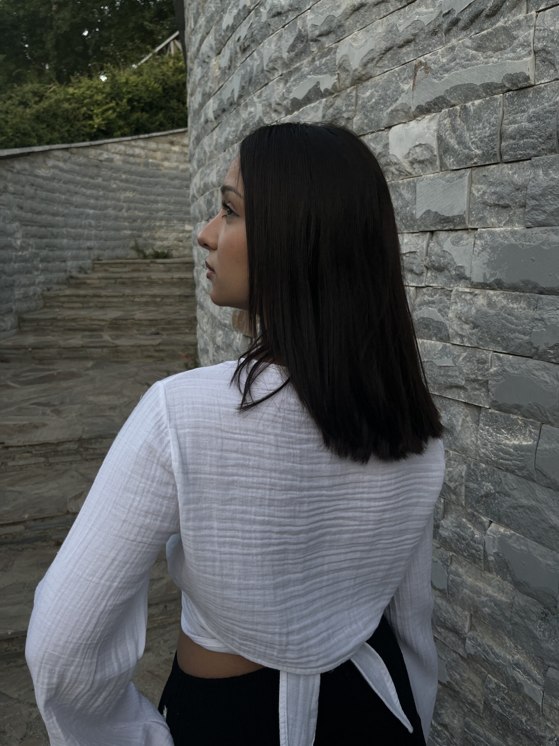 Gardırobunuza modern bir dokunuş katacak olan Moon Spirit Woman Kruvaze Yaka Crop Bluz, özgür ruhunu yansıtan tasarımıyla dikkat çekiyor.